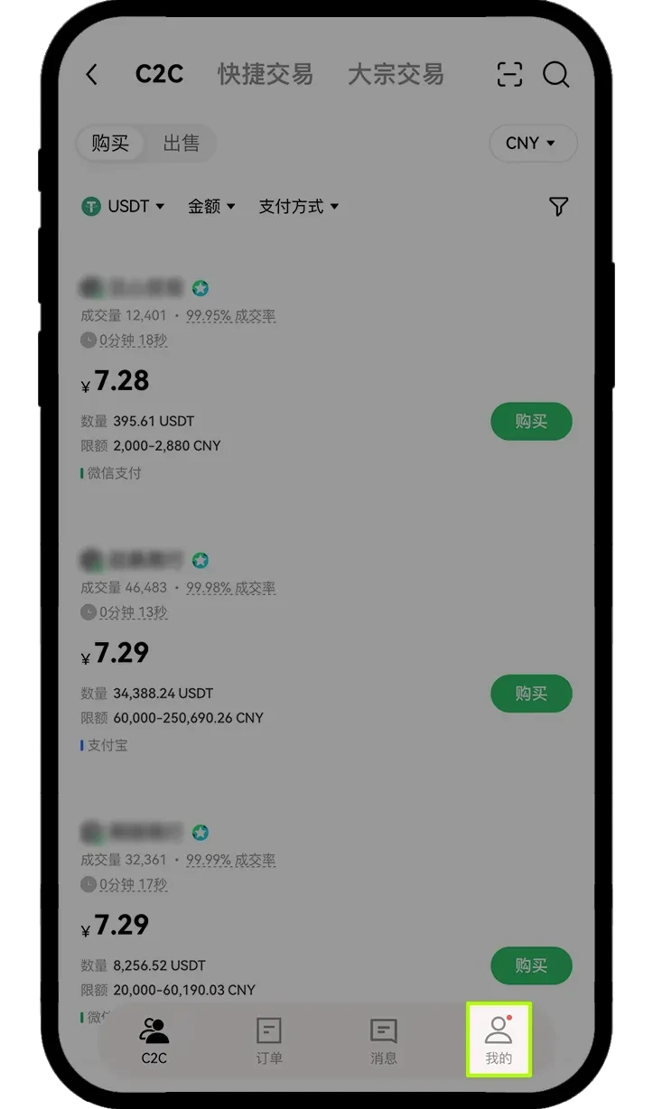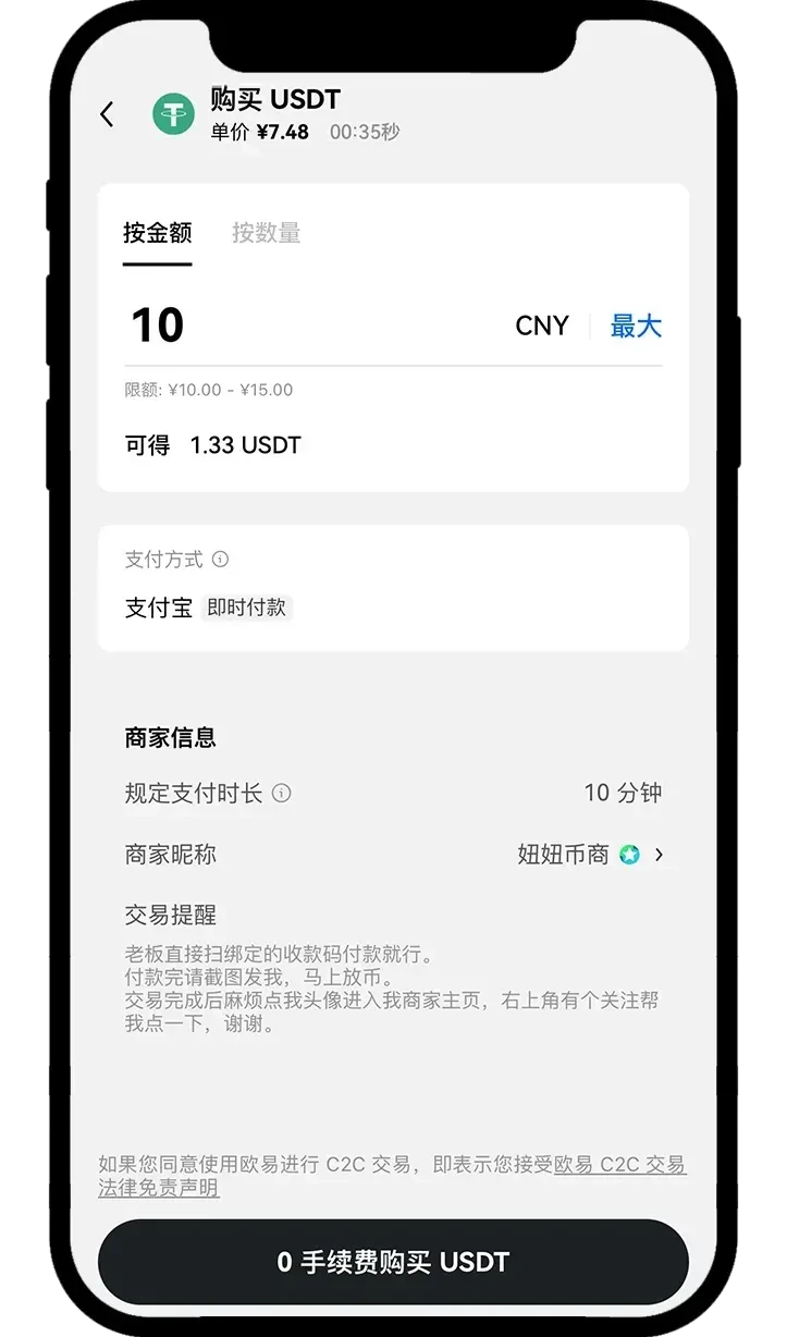 点击首页【买币】-【 C2C 买币】,选择合适的商家进行交易,点击【购买】- 输入想要购买的数量或金额,点击【 0 手续费购买 USDT】,进入订单页面,确认信息并完成支付后,务必确认收到币后点击【我已支付】。