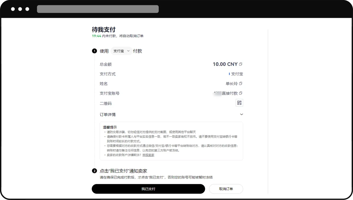 2. 订单生成后,确认订单信息,如果您对订单信息有疑问,可以点击【取消订单】;如果信息无误,请点击【订单详情】。请及时打开手机银行 App / 支付宝 / 微信,输入对方账户信息进行付款。请务必在完成付款之后,再点击【我已支付】。对方核实款项后,您所购买的数字资产就会发放给您。新手用户买币成交 <3 单时,点击【已支付】后,页面将出现弹窗,需要您上传付款证明。