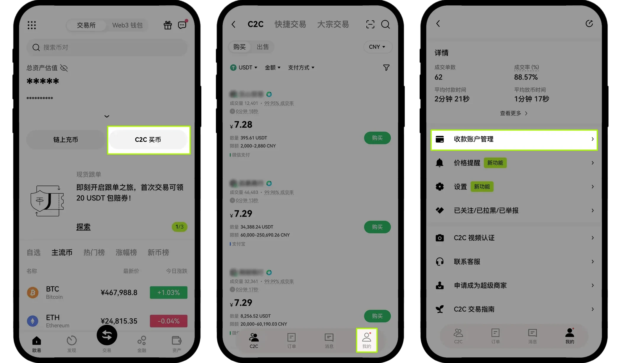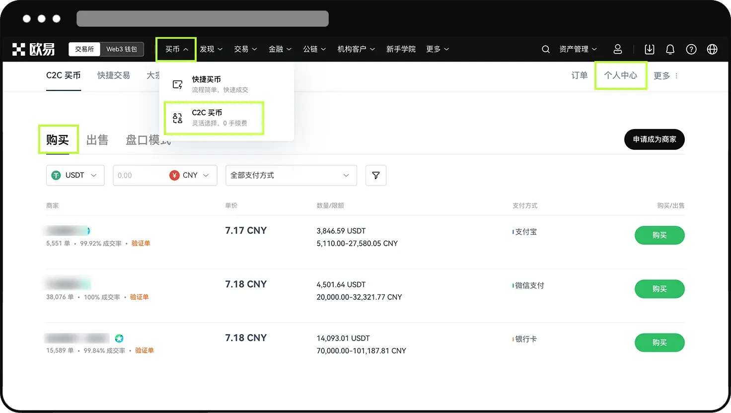 欧意快捷和 C2C 买/卖币全流程(App/Web端)