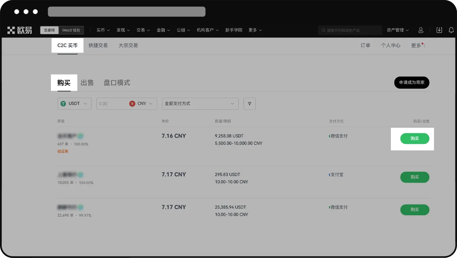 1. 打开欧意 App 首页,点击【C2C 买币】。在购买页面,点击【USDT】可以搜索数字资产,点击【筛选】可以选择委托单类型和支付方式。设置完成后,选出符合条件的商家,点击【购买】。