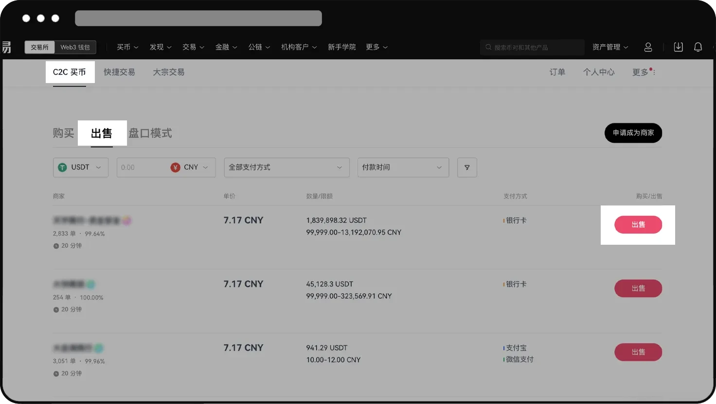 3. 您还可以选择 C2C 卖币,打开欧意官网( www.okx.com ),点击【买币】-【C2C买币】-【出售】。可以根据商家的信用等级、完成率、平均放币时间、支付方式、单价等,自主选择交易商家。具体交易步骤与快捷买卖相似,按页面提示操作即可。