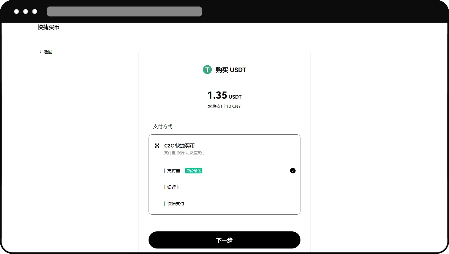 注意:在快捷买币中,当购买数量不满足商家设置限额时,支付方式只能选择支付宝/微信,建议选择 C2C 买币可看到限额条件灵活选择。