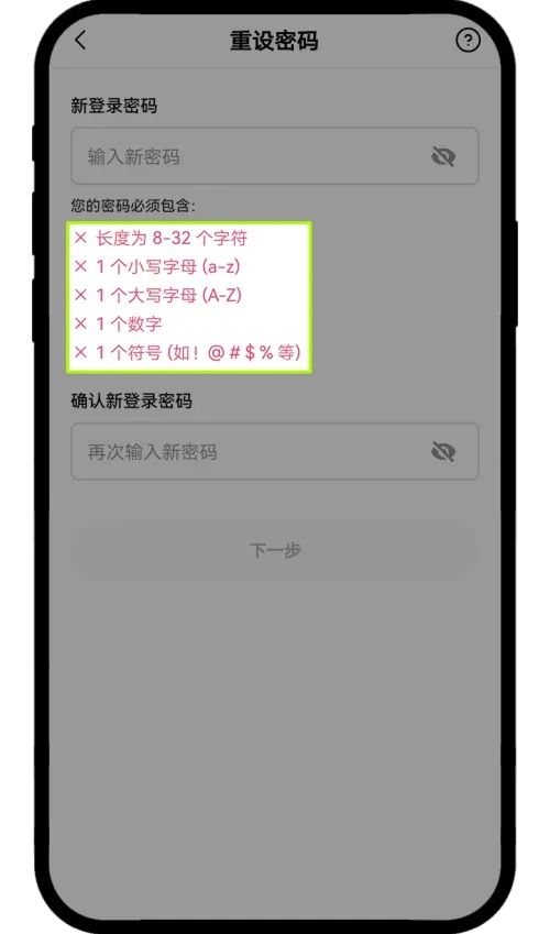 强密码是防止未经授权访问的第一道防线。建议您使用包含大小写字母、数字和特殊字符的复杂密码。确保密码长度至少为 8 个字符。避免在不同账户间重复使用密码。