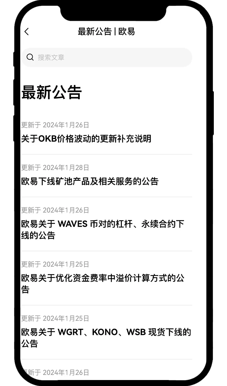 App端:打开欧意App,在首页下方找到公告栏,任意点击一条公告进入【公告中心】,下滑即可查看最新活动。
