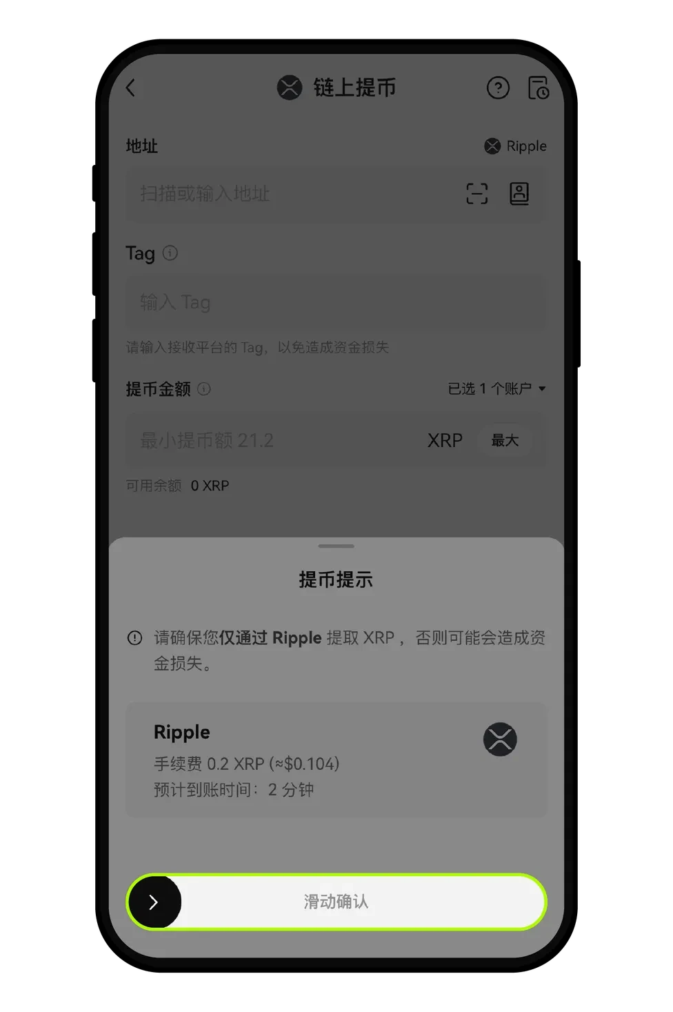 2. 选择目的地【交易所或钱包】— 页面将显示提币提示【滑动确认】后,即可输入/粘贴对方【充值地址】